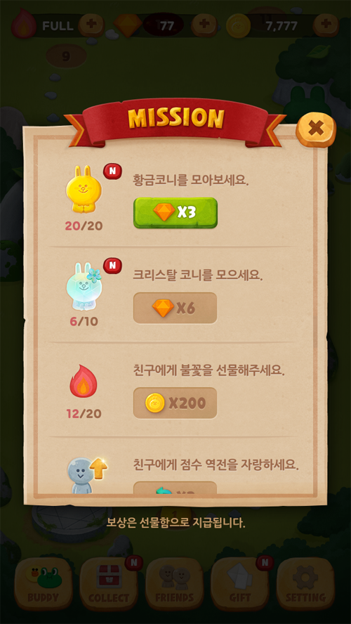 미션은 스테이지 클리어, 황금코니 수집, 아이템 구매 등 여러 종류가 있으며 미션을 완료하면 그에 해당하는 보상을 받을 수 있습니다.
