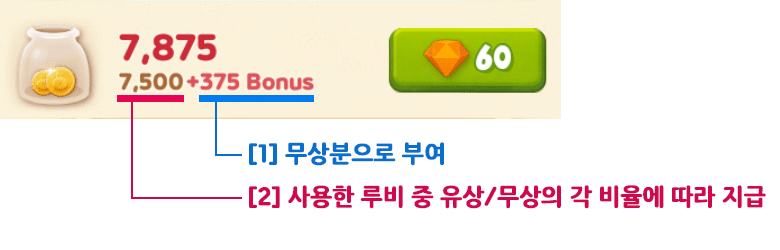 구입 시 사용한 루비의 유상분이 차지하는 비율에 따라 코인의 유상분을 부여하고 있습니다.