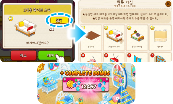 - 세트로 구성된 모든 종류의 데코를 배치하면 컴플리트 보너스 점수를 받을 수 있습니다.