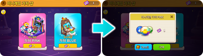 - [브라운 게임 센터]→[미니게임 가챠 샵]에서 '미니게임 가챠 티켓'을 사용해 가챠를 이용할 수 있습니다.