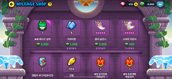 `마일리지 포인트`는 레인저/장비 가챠를 돌리면 획득할 수 있습니다. 마일리지 상점에서 다양한 아이템과 교환할 수 있습니다.