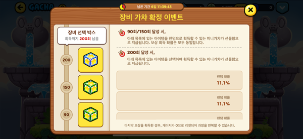 ⋅장비 : 90회 - 랜덤 보상, 150회 - 랜덤 보상, 200회 - 선택 보상이 지급됩니다.