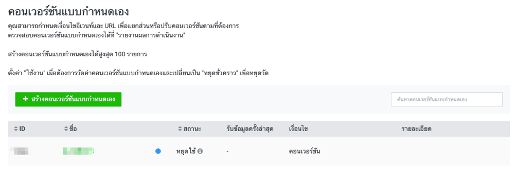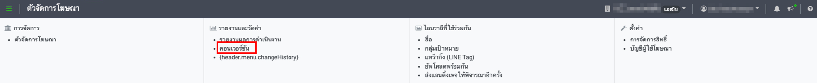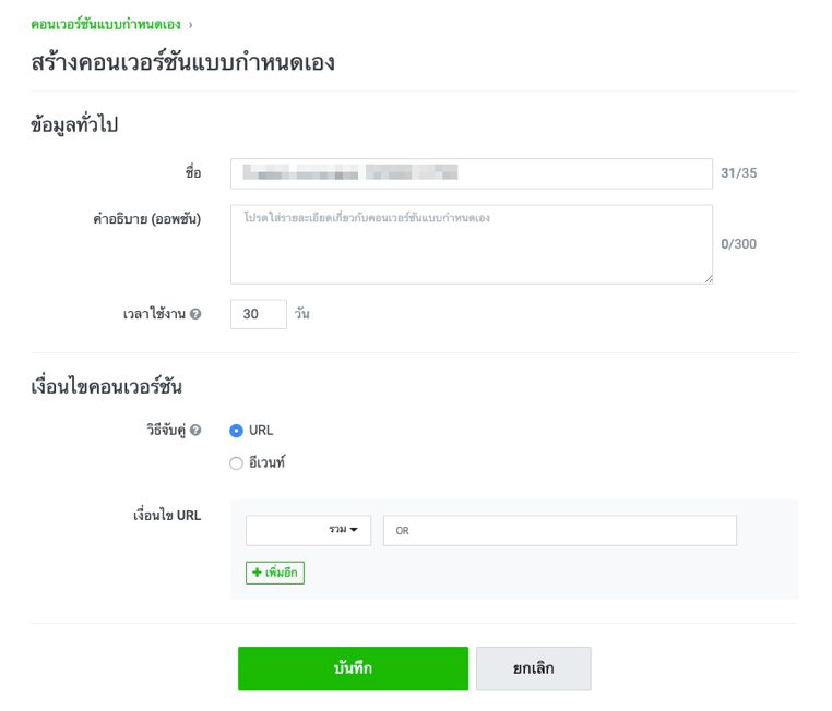เว็บไซต์คอนเวอร์ชัน คือ การวัดผลคอนเวอร์ชันบนเว็บไซต์ การวัดผลคอนเวอร์ชันบนเว็บไซต์จำเป็นต้องติดตั้ง LINE Tag * กรุณาตรวจสอบวิธีติดตั้ง LINE Tag ที่นี่ การวัดผลเว็บไซต์คอนเวอร์ชันมี 2 ประเภท คือ การวัดผลโดยใช้คอนเวอร์ชันโค้ด และ การวัดผลโดยคอนเวอร์ชันแบบกำหนดเองการวัดผลโดยใช้คอนเวอร์ชันโค้ด จำเป็นต้องติดตั้งคอนเวอร์ชันโค้ดในตำแหน่งคอนเวอร์ชัน * กรุณาตรวจสอบวิธีติดตั้งคอนเวอร์ชัดโค้ด ที่นี่ เมื่อผู้ใช้คลิกที่โฆษณาซึ่งแสดงบน LINE Ads Platform แล้วเข้าชมเว็บไซต์ที่ติดตั้งคอนเวอร์ชันโค้ดเอาไว้ ระบบจะเรียก LINE Tag ขึ้นมาทำงานและนับจำนวนคอนเวอร์ชัน ระบบจะตรวจสอบข้อมูล Cookie ของผู้ใช้ที่เยี่ยมชมเว็บไซต์ว่ามีการคลิกที่โฆษณาหรือไม่ หากมีการคลิกโฆษณาในช่วงระยะเวลาการวัดผล (คอนเวอร์ชันโค้ดมีระยะเวลา 30 วัน) จะถูกนับเป็นค่าคอนเวอร์ชัน * ผลลัพธ์ที่ได้จากการวัดผลคอนเวอร์ชันจะอัปเดตในข้อมูลหัวข้อ CV บนแดชบอร์ดของหน้าจอแอดมิน * คอนเวอร์ชันแบบกำหนดเองสามารถตั้งค่าระยะเวลาการใช้งานได้ 1-180 วัน * บางกรณีอาจไม่สามารถวัดผลได้ถูกต้อง โดยมีสาเหตุจากเวอร์ชันของอุปกรณ์ หรือวันหมดอายุของข้อมูล Cookieการวัดผลด้วยคอนเวอร์ชันแบบกำหนดเอง คอนเวอร์ชันแบบกำหนดเอง เหมาะสำหรับกรณีต่อไปนี้ - ต้องการติดตั้งคอนเวอร์ชันโค้ดในตำแหน่งอื่นที่ไม่ใช่ตำแหน่งคอนเวอร์ชัน - ต้องการวัดผลคอนเวอร์ชันด้วย URL หรืออีเวนท์ที่กำหนดเอง - ต้องการความยืดหยุ่นในการปรับเปลี่ยนระยะเวลา ขั้นตอนการสร้างคอนเวอร์ชันแบบกำหนดเอง : 1. คลิกแท็บ "บัญชีผู้ใช้โฆษณา " ในหน้าแรก > คลิกเลือกชื่อบัญชีผู้ใช้โฆษณาที่ต้องการสร้างคอนเวอร์ชันแบบกำหนดเอง 2. คลิกที่ "≡ " ด้านซ้ายบนของหน้าตัวจัดการโฆษณา > ไปที่หัวข้อ "รายงานและวัดค่า " > คลิกที่ "คอนเวอร์ชัน " 3. คลิกที่ "+ สร้างคอนเวอร์ชันแบบกำหนดเอง " ที่รายการคอนเวอร์ชันแบบกำหนดเอง > กรอกข้อมูลแต่ละหัวข้อแล้วคลิกที่ "บันทึก " * ช่อง "รับข้อมูลครั้งล่าสุด " จะแสดงวันและเวลาที่มีการวัดผลคอนเวอร์ชันครั้งล่าสุด * สามารถตั้งระยะเวลาได้ 1-180 วัน กำหนด URL : อาจระบุ URL หรือคีย์เวิร์ด 1 เงื่อนไข หรือใช้ OR/AND เพื่อกำหนดหลายเงื่อนไข (ไม่สามารถกำหนดค่ากว้างๆ เช่นแทนค่าตัวอักษรบางส่วนในคำด้วยเครื่องหมายดอกจัน ( * ) หรือกำหนดเพียงตัวอักษรเริ่มต้นของคำได้) <เป้าหมายที่จะวัดผลคอนเวอร์ชัน> URL_A กับ URL_ B - กำหนดเงื่อนไข OR : URL_A หรือ URL_ B อย่างใดอย่างหนึ่ง - กำหนดเงื่อนไข AND : ไม่สามารถวัดผลได้ (ไม่สามารถกำหนดเงื่อนไขเป็น "เข้าชมทั้ง URL_A และ URL_ B" ได้) keyword_A กับ keyword_ B - กำหนดเงื่อนไข OR : URL ที่มี keyword_A หรือ keyword_ B รว