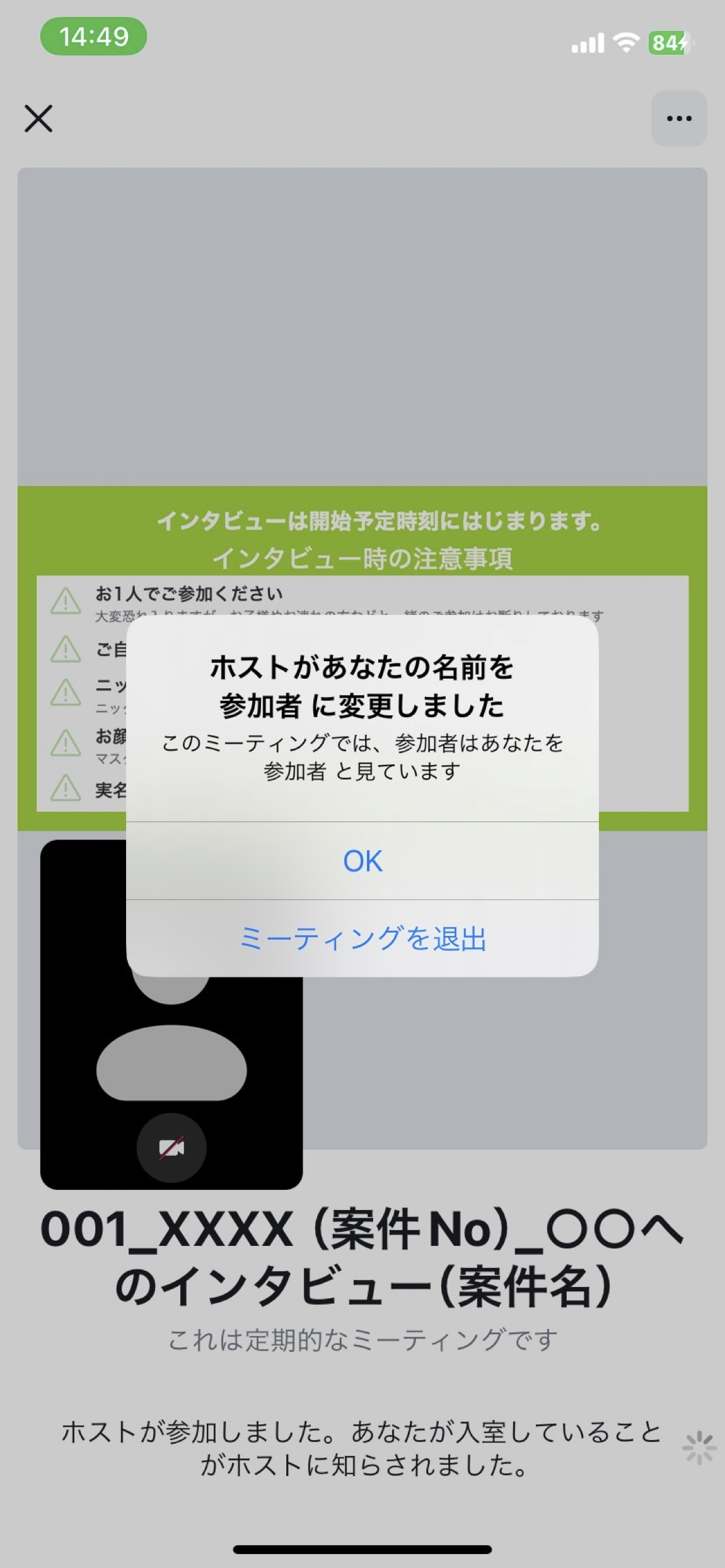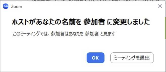 「ホストがあなたの名前を 参加者 に変更しました」と表示されたら、「OK」を選択してください。