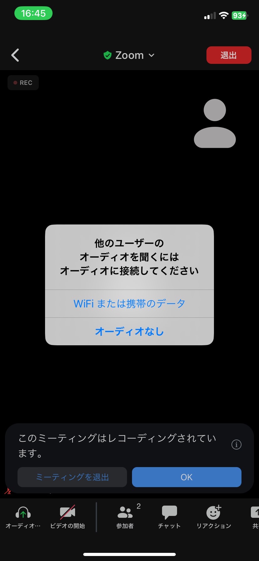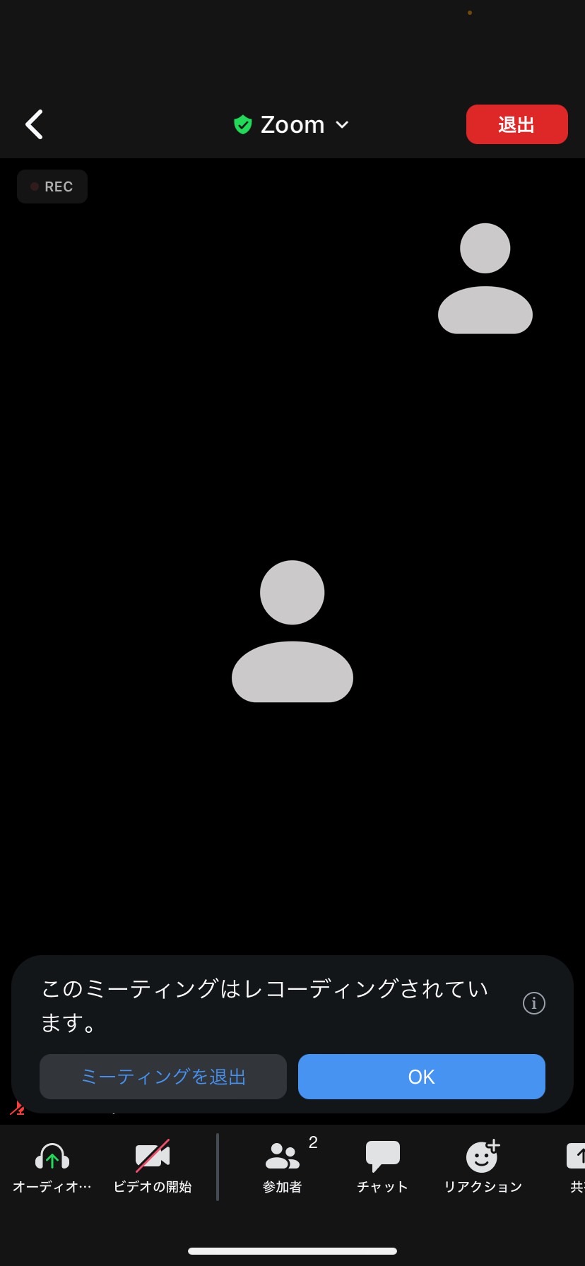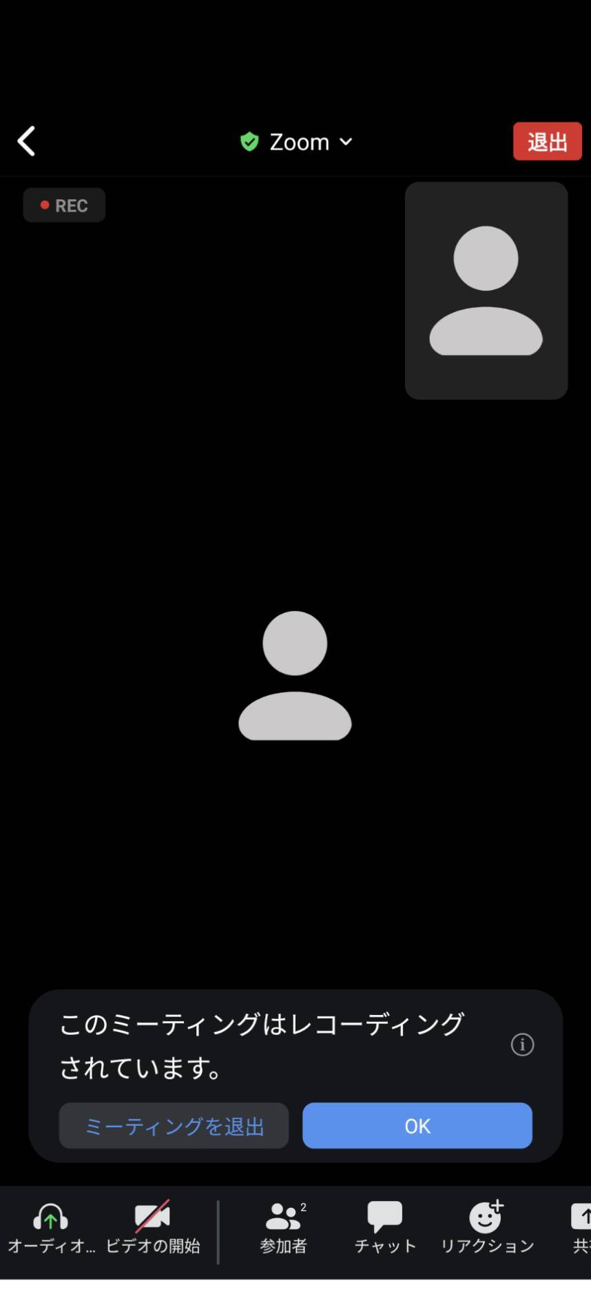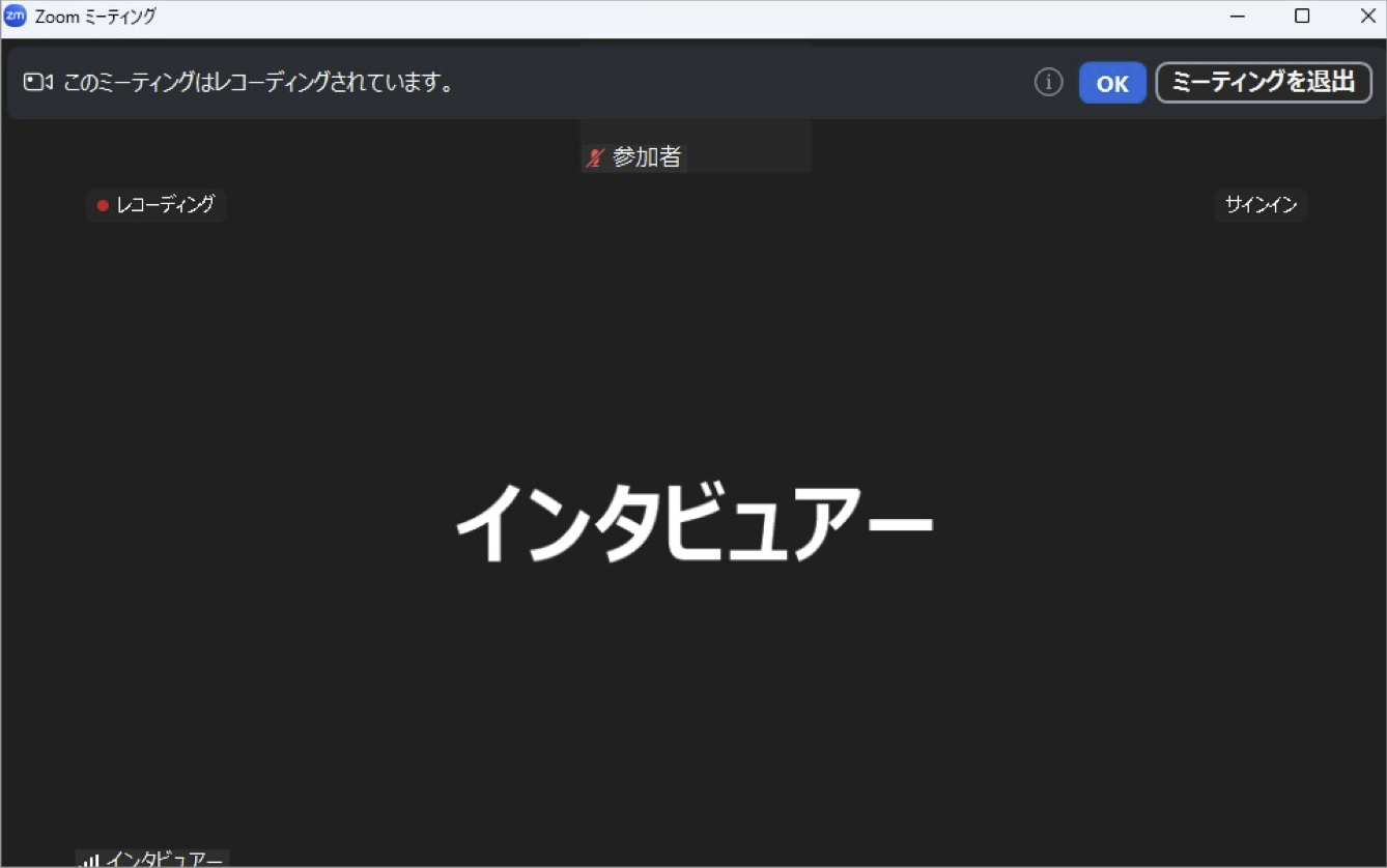 8. 画面上部の「このミーティングはレコーディングされています。」表示内の「OK」を選択してください。