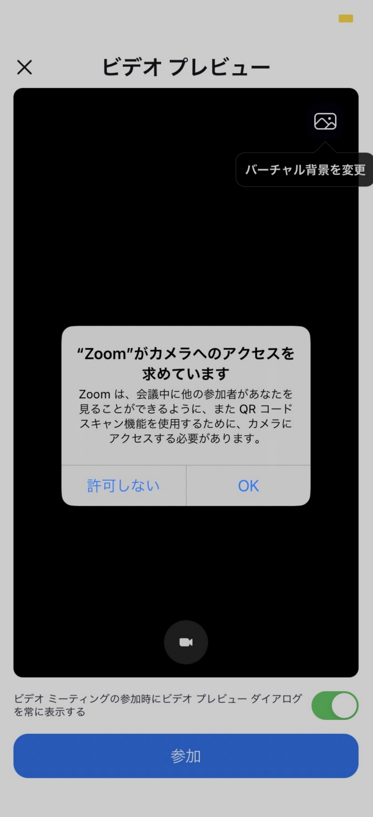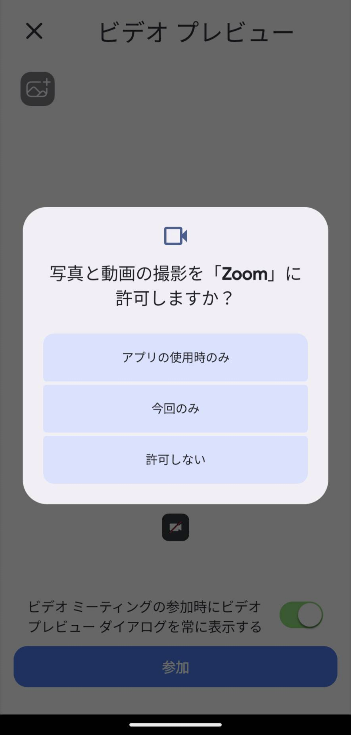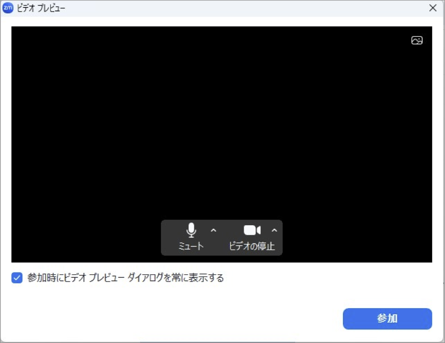 6. 下記画面にて、「ミュート」 / 「ビデオの停止」がONであることを確認し、「参加」をクリックしてください。