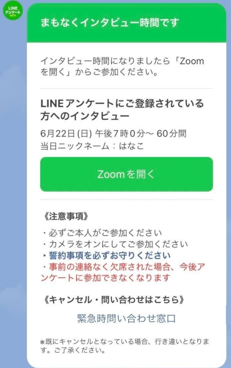 3. ログイン後、インタビュー開始1時間前に送信されるメッセージに記載の「Zoomを開く」ボタンをクリックしてください。