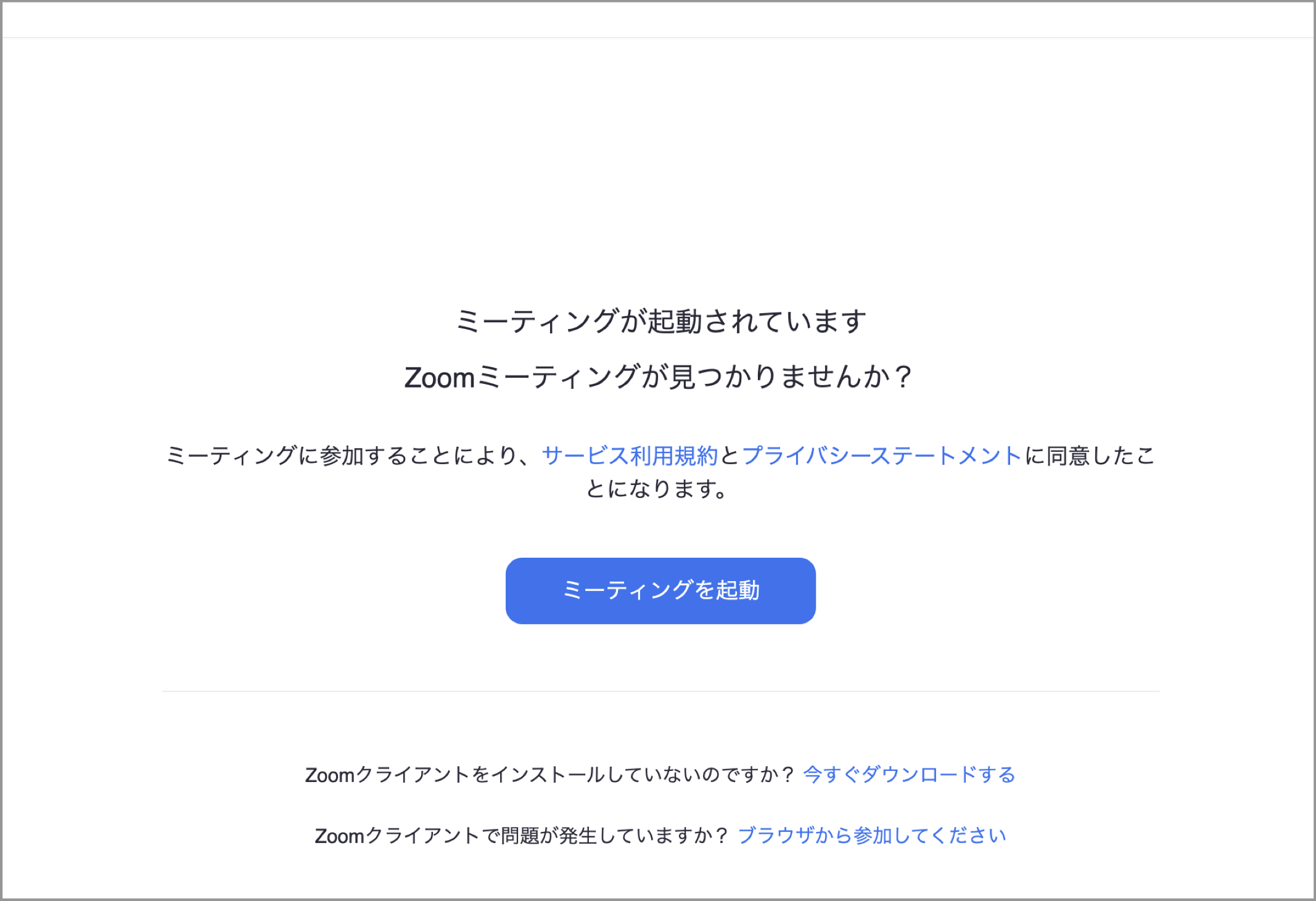 4. Zoomが立ち上がりますので、下記画面にて「ミーティングを起動」をクリックしてください。