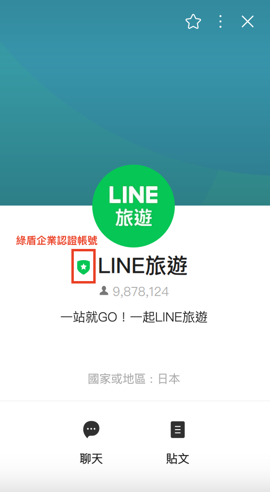 「LINE旅遊」官方服務帳號為「綠盾」企業帳號,敬請留意。