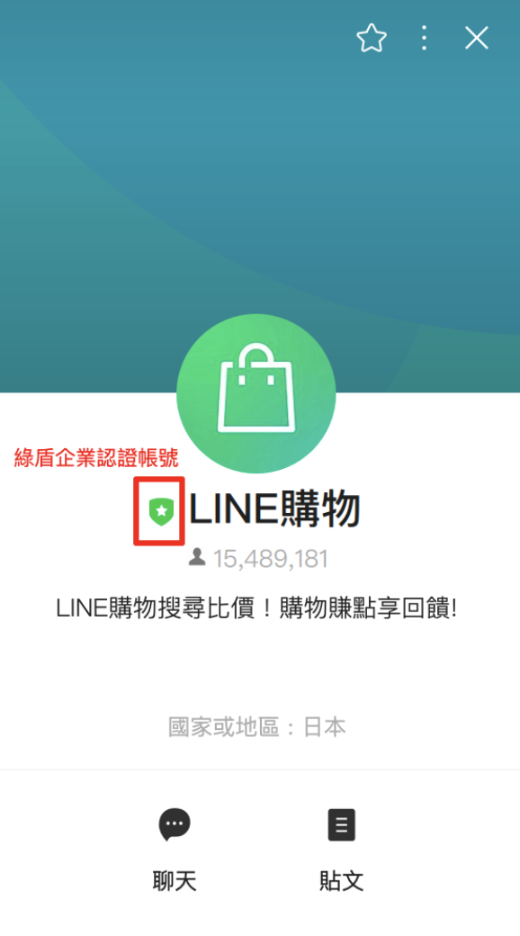 「LINE購物」官方服務帳號為「綠盾」企業帳號,敬請留意。
